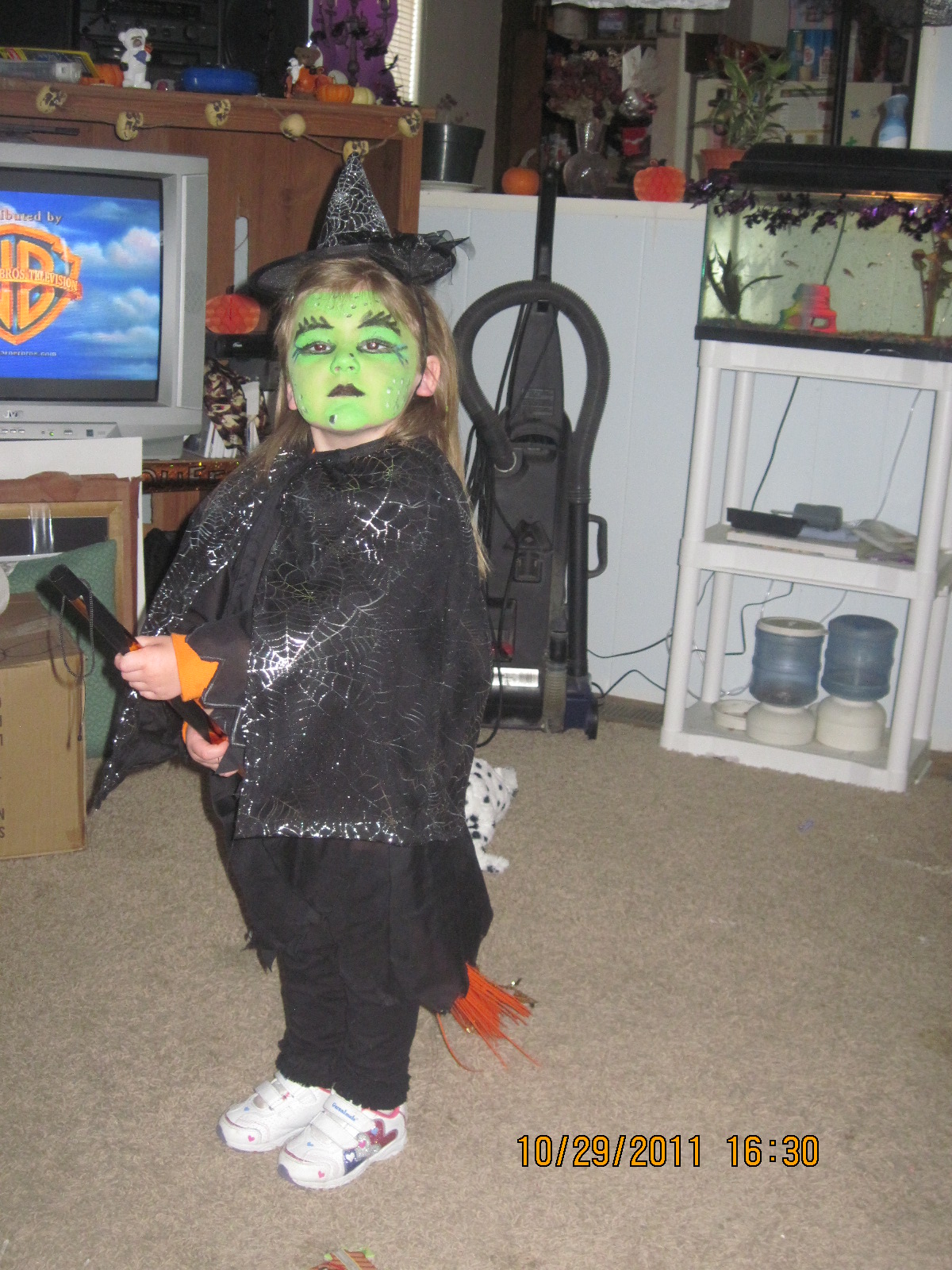 This year for Halloween you went as a witch. You had to be scary or "mean" as you put it. So we painted your face green and I decked you out with a "mean" witch face. But most people just thought you were cute.